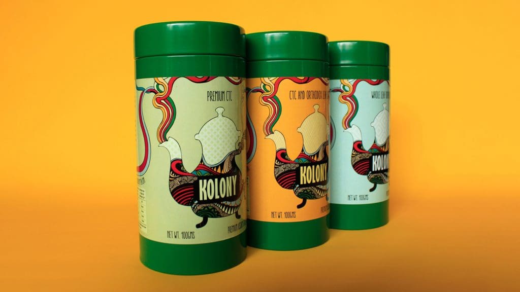 SCOPE OF PROJECT: Packaging Design Packaging Design For Kolony Tea we used a bright and dynamic style, illustrated by hand, influenced by India. The packaging design is bold, unique, unpredictable.