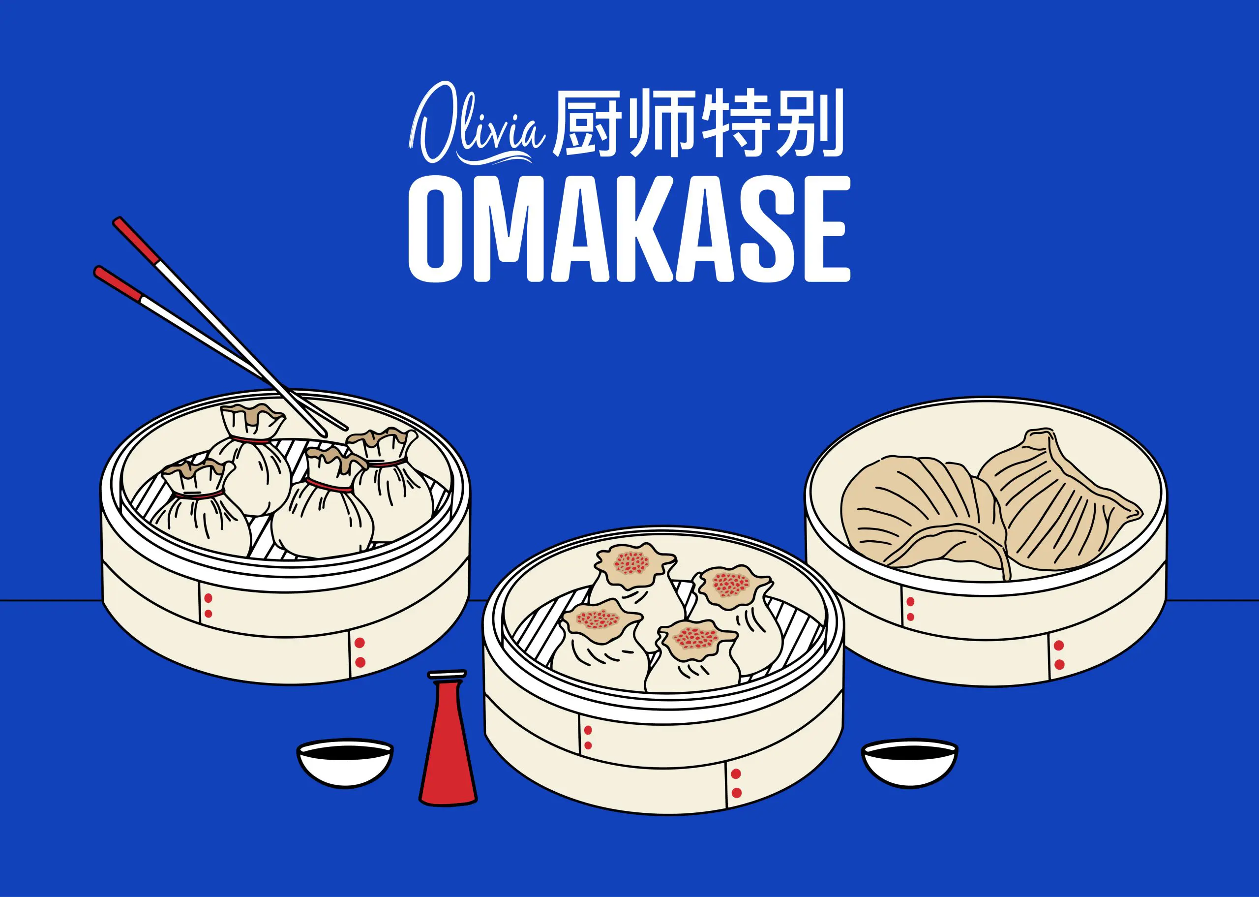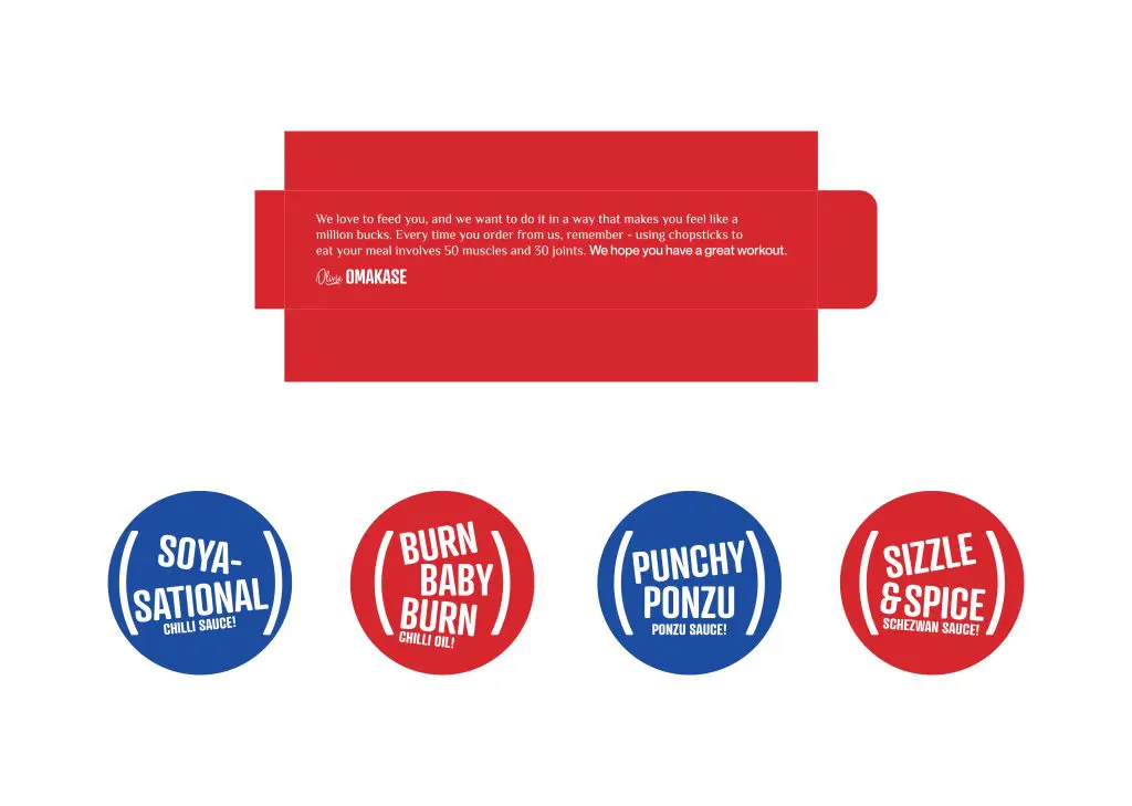 Olivia Omakase’s brand identity mirrors its unique concept, built around the Jester archetype — clever, witty and playful. The brand’s colour hierarchy comprises five distinct colours: Blue, Red, Black, Beige and White, used with intention to create contrast and visual rhythm. Although the brand has four fonts including a system font, the typography is simple and easily legible, ensuring that the brand remains approachable. A simple line illustration style is used where brand colours are applied sparingly. Distinctive graphic elements — brackets, punctuation marks, tilted text, Chinese characters, round-edged boxes, playful circular text wraps and patterns contribute to the brand’s witty and dynamic personality.