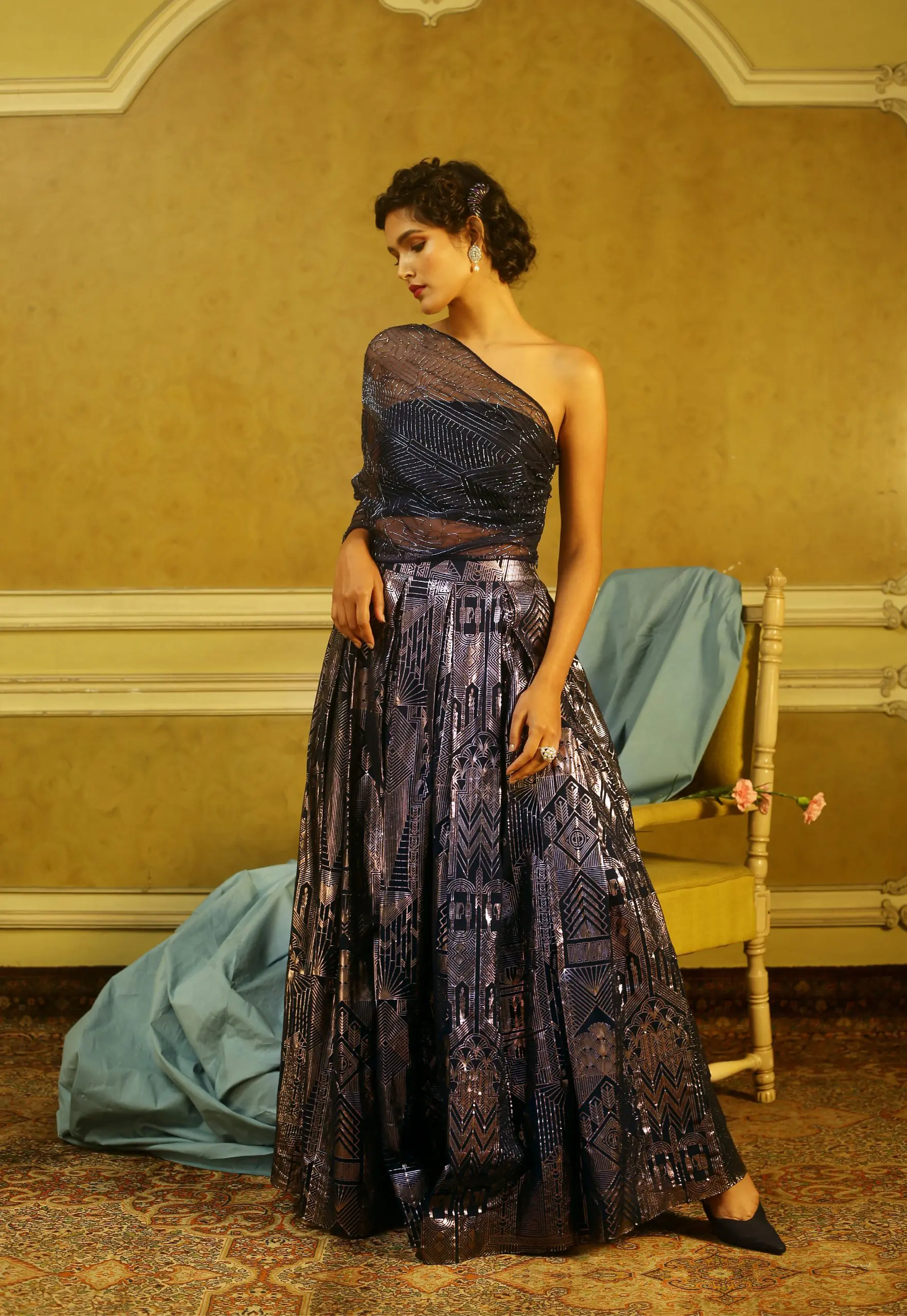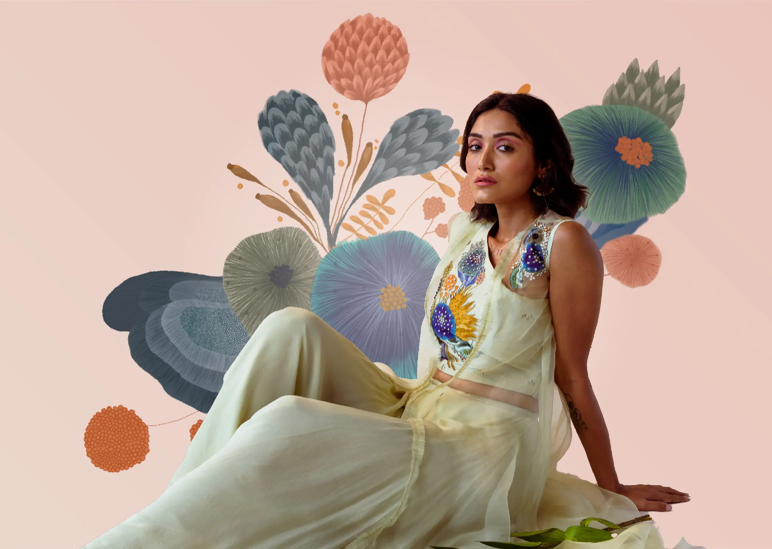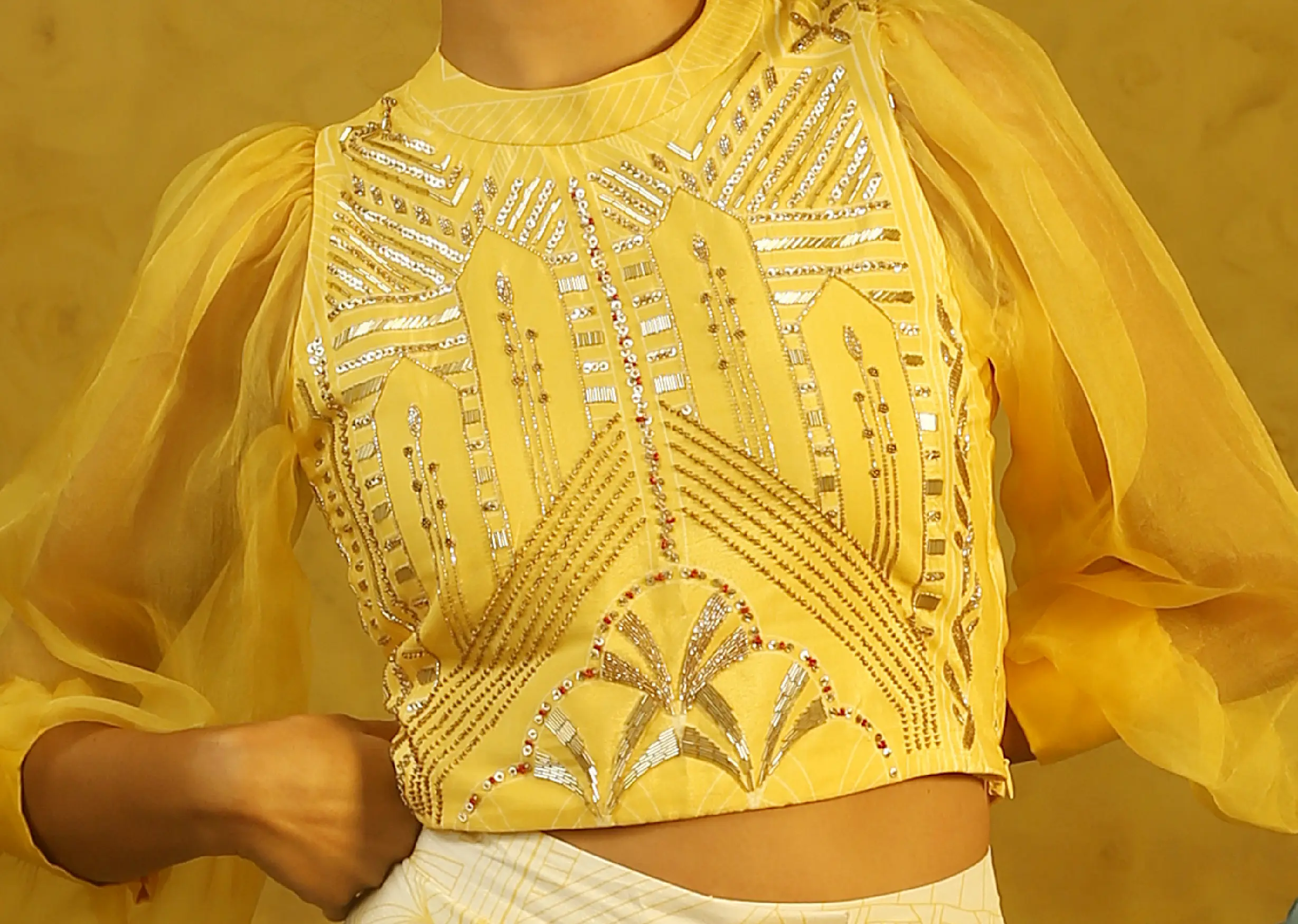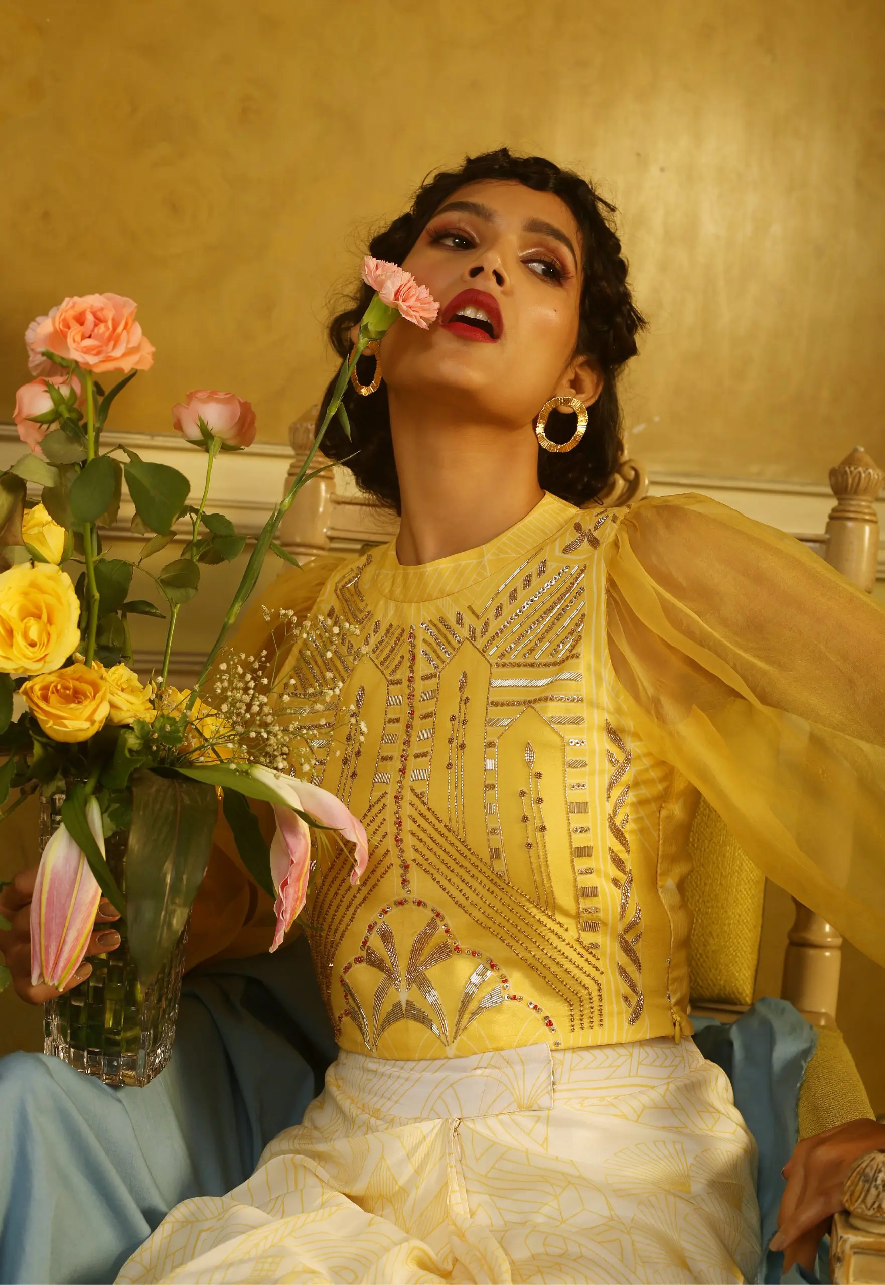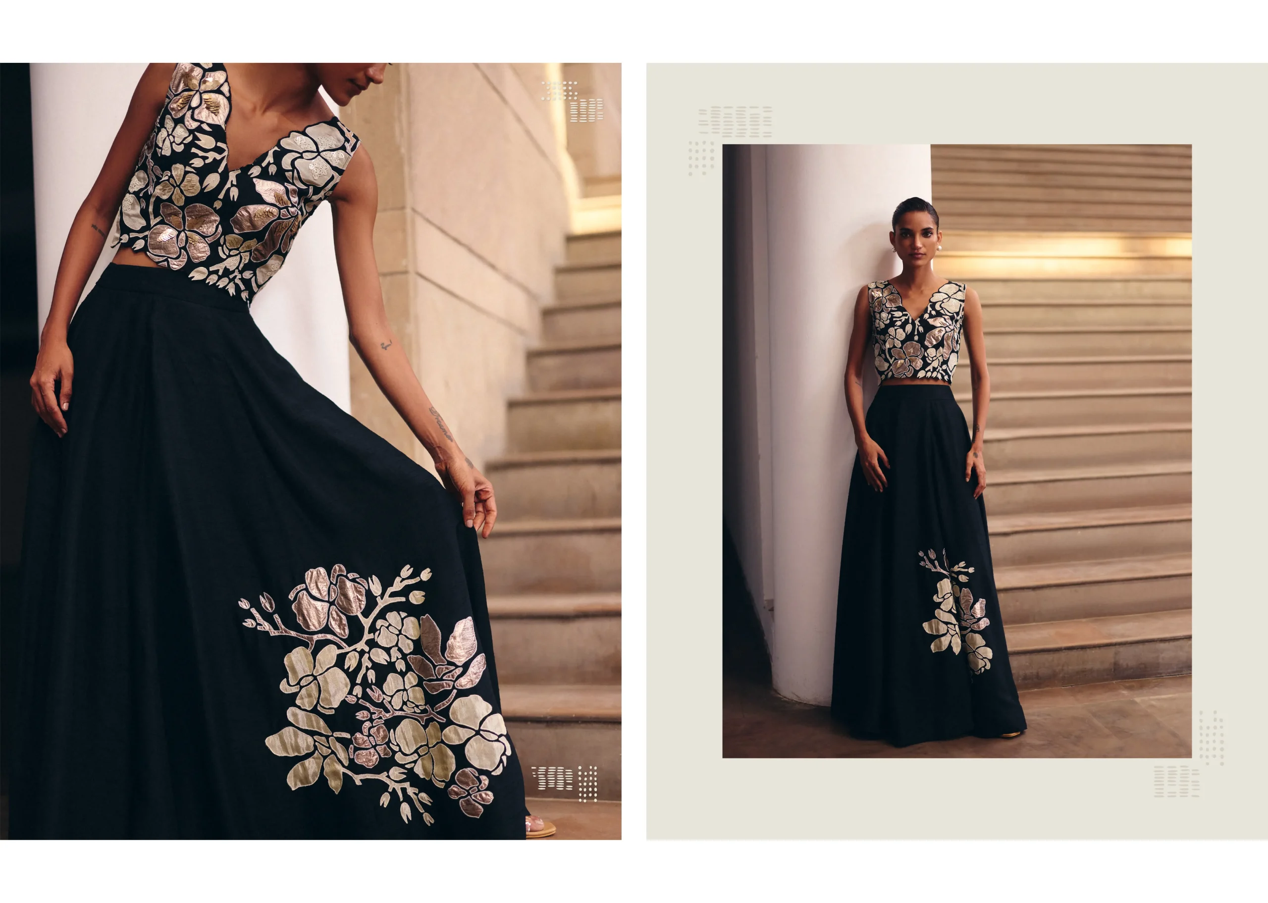 For All That Jazz, the Winter Festive 2019 collection, we were inspired by the Art Deco movement that debuted in Paris in the 1920s. Symmetrical, geometrical and pleasing to the eye, this architectural trend soon evolved into a cultural phenomenon. While creating the patterns, the rule of symmetry was kept in mind, and monolines were used to digitally create the design. Our patterns came to life across garments in print, foiling and beadwork.