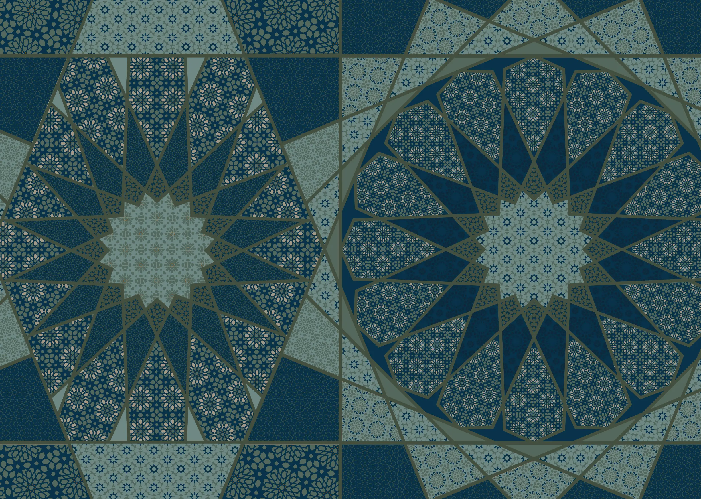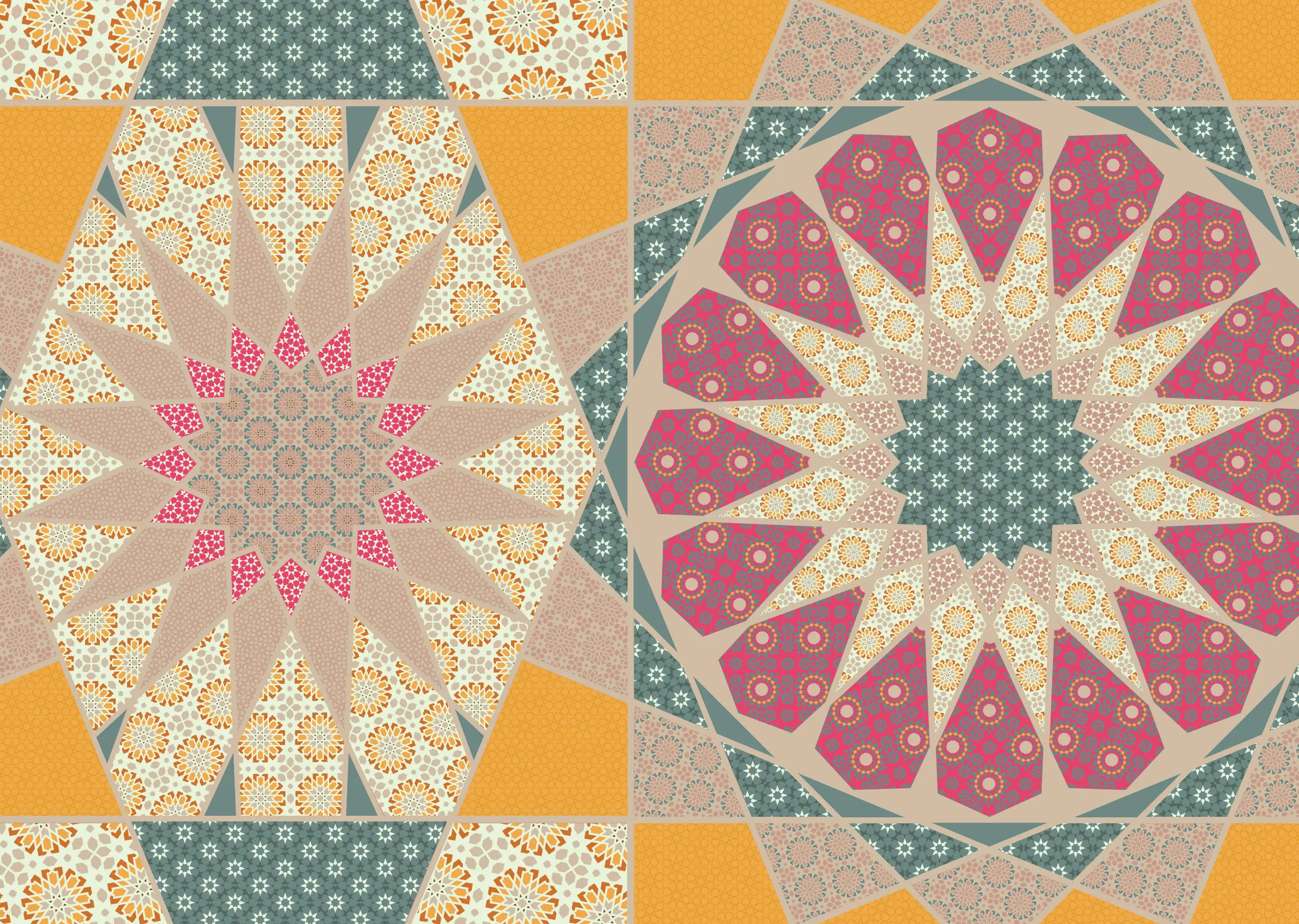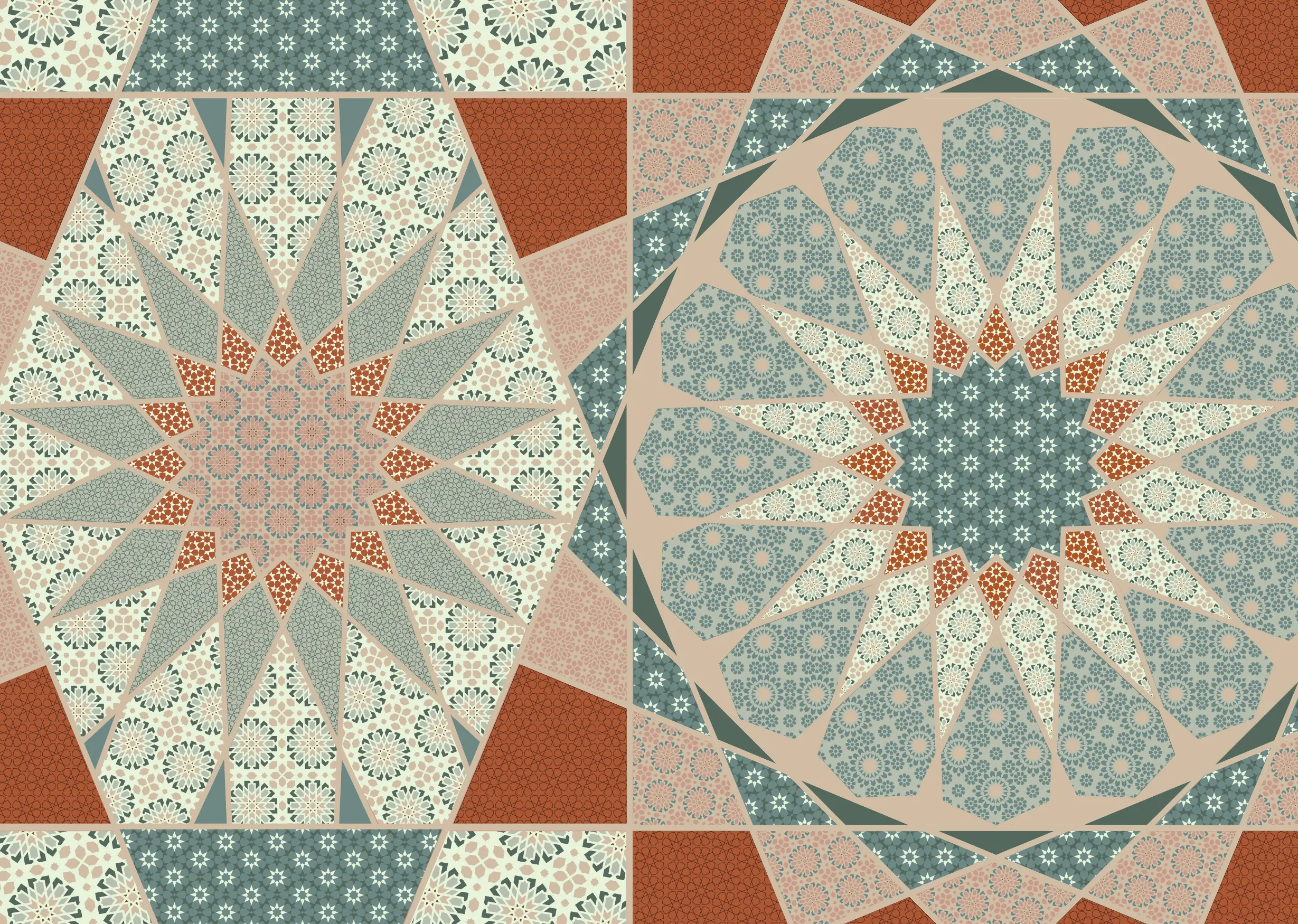 Lanes of Marrakech was inspired by a walk through the Lanes of Morocco, drawing from its colourful and complex architecture. The intricate mosaic work on the ceilings and walls became the centre point of the design. Each tiny element of the mosaic seen here is actually an individual vector, ultimately put together to create a larger pattern; a reflection of how each small piece was part of a larger architectural design.Two completely different colour palettes were applied on the artwork – The blue palette being closer in reference to Moroccan shades; whereas the warmer palette adds freshness to the same pattern.