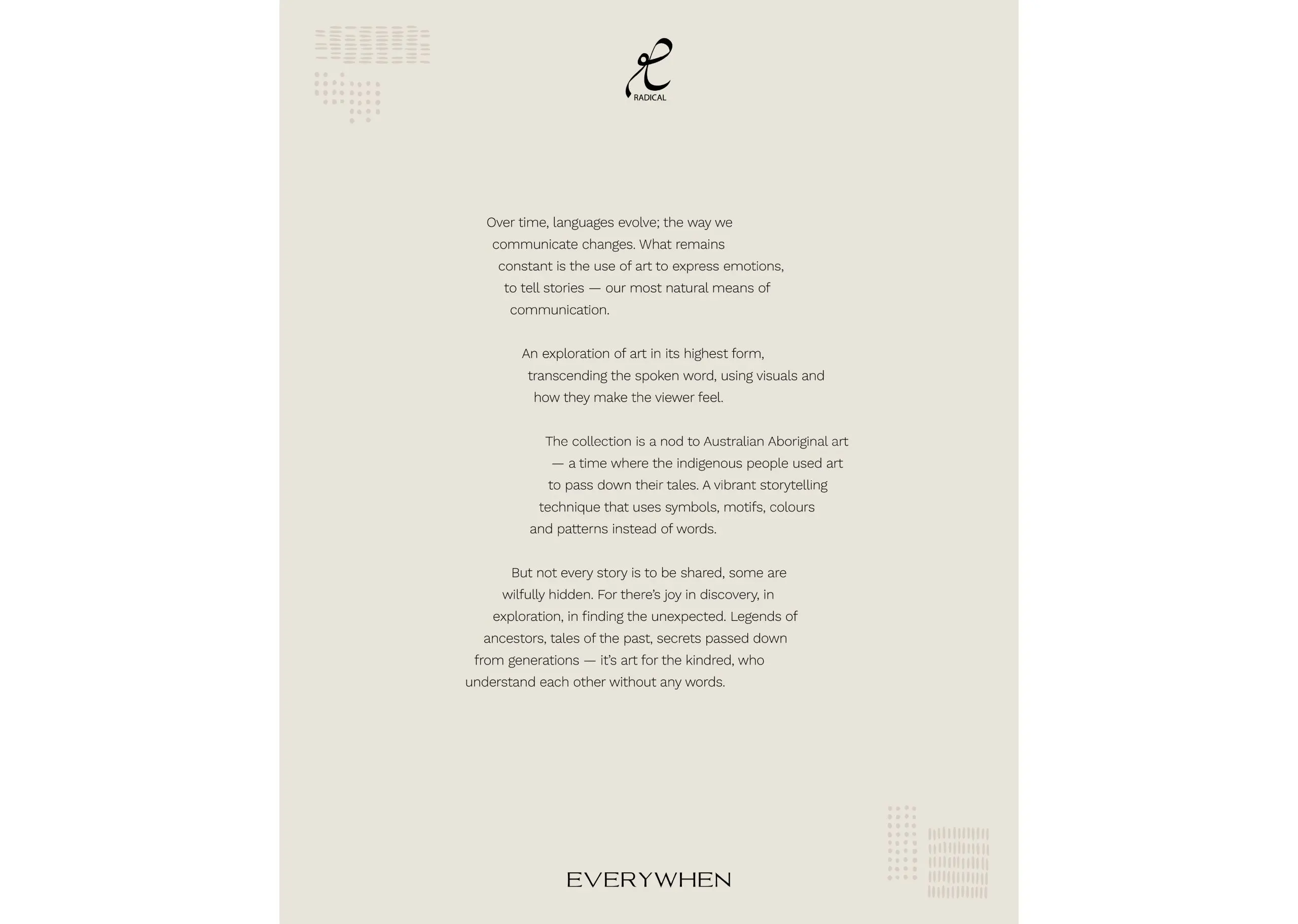 A collection inspired by Australian Aboriginal art, Everywhen made its way to social media in an interesting blend of stills and videos — supported by a dash and dot pattern, designed to bring out the texture of the garments.