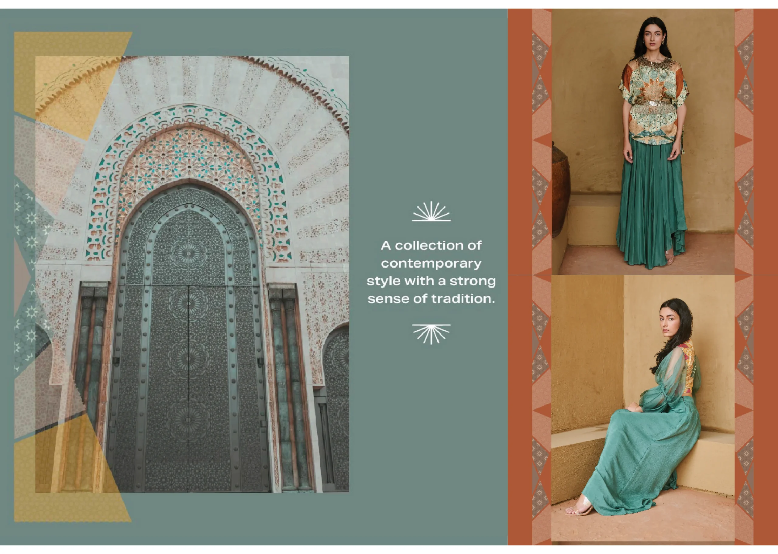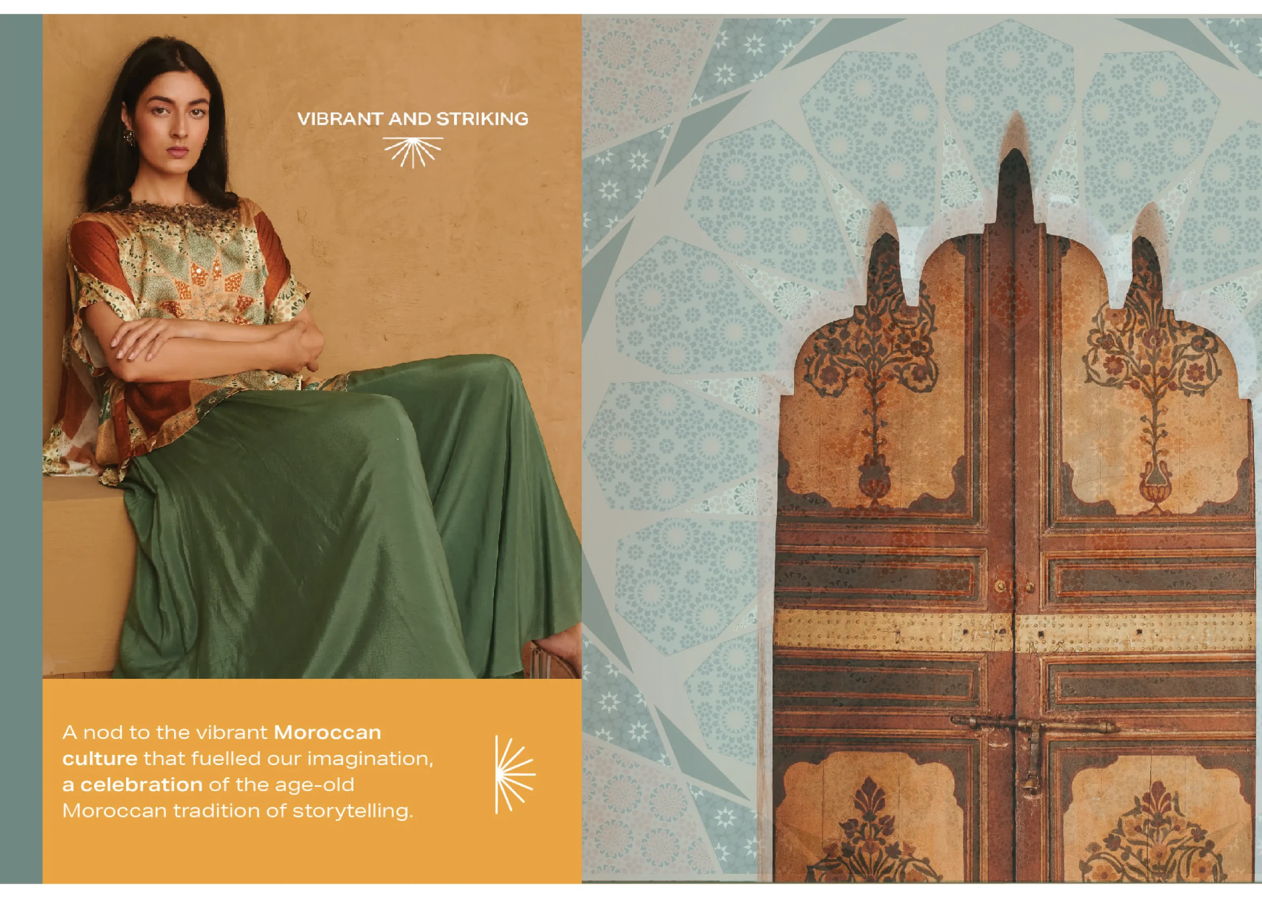 The images convey the maximalism of Morocco against a minimal set which immediately transported one to Marrakech. The walls of the set were painted to imitate mud walls, and achieve the warmth of the desert terra, which carried a hint of the sun within itself. The souks of Morocco are delightful places filled with fantastical objects and homegrown earthenware. This influence was extended to the props chosen – urns that are found in every souk.